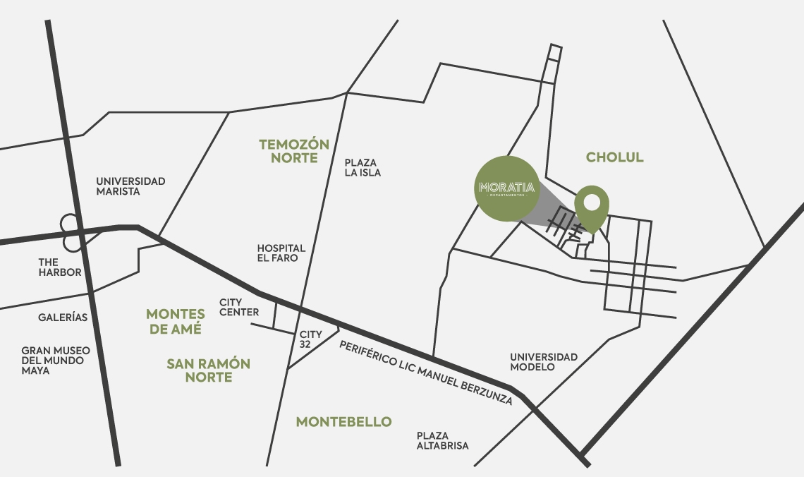Moratia Departamentos es el lugar ideal para ti por su ubicación privilegiada en Cholul, al norte de Mérida, a solo minutos de centros comerciales, universidades y con acceso rápido al periférico.